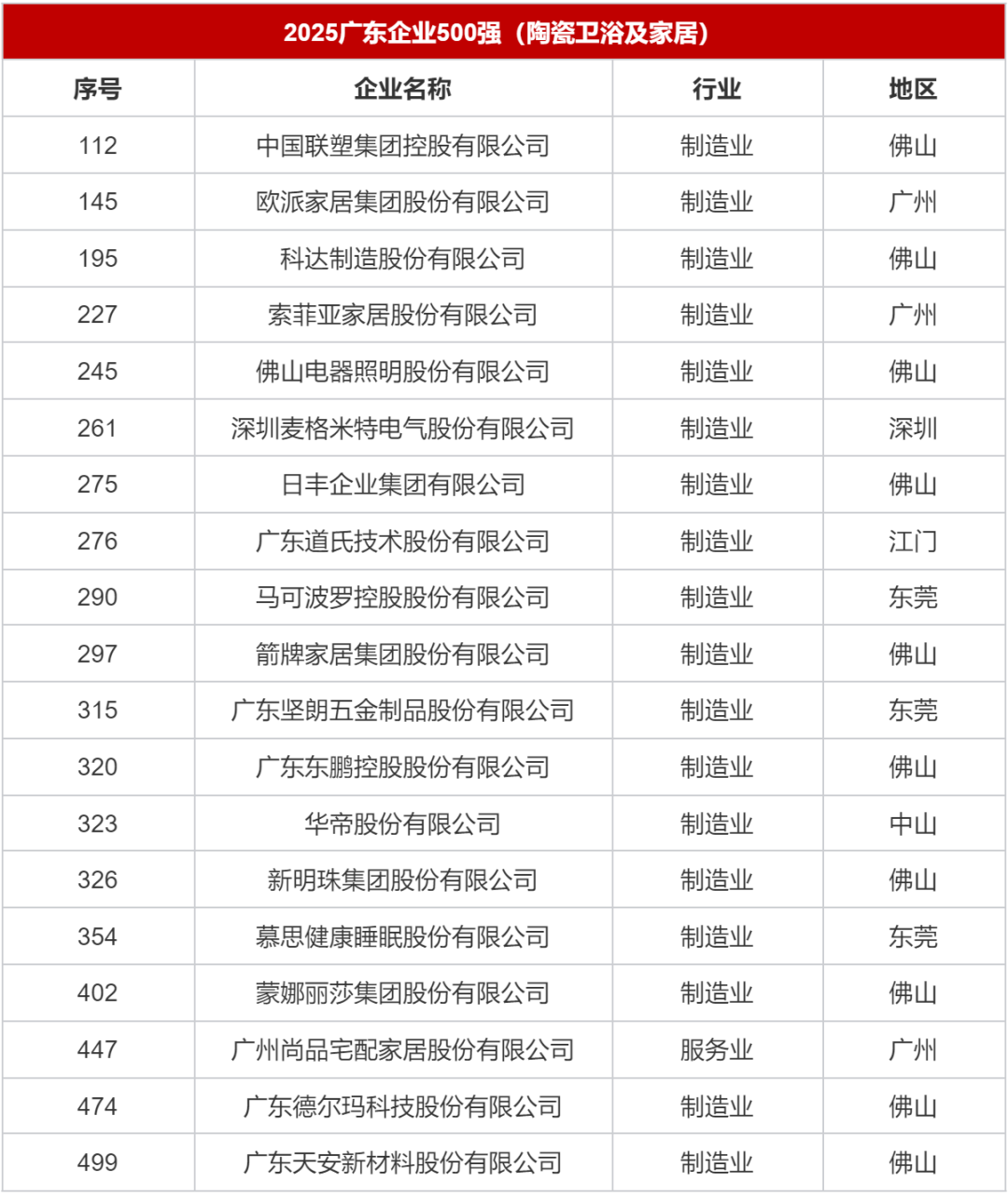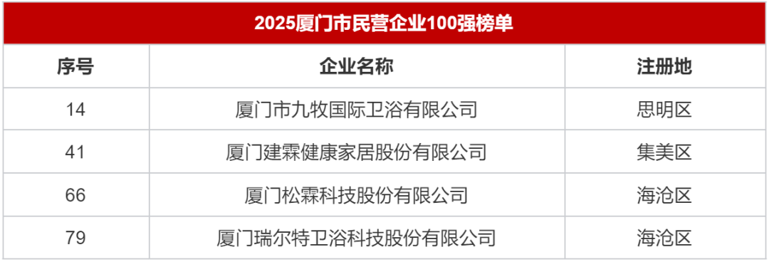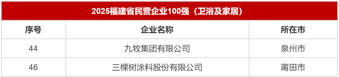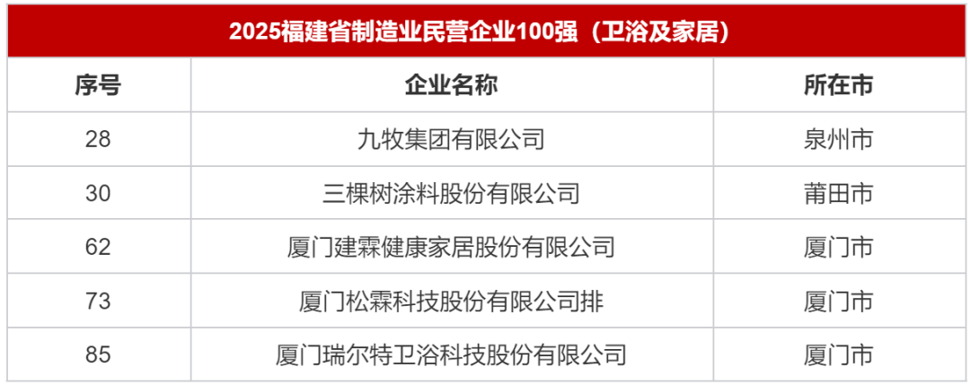 多省市发布“500强”“100强”榜单,九牧、箭牌、东鹏、日丰、松霖、瑞尔特等企业上榜近日,广东、福建、浙江、厦门等省市发布当地企业排行榜,多个卫浴及家居企业上榜,包括联塑、欧派、麦格米特、日丰、箭牌、九牧、松霖、建霖、瑞尔特等。榜单主要以2024年营业收入为标准,也有省市以研发投入、创新成果等罗列出创新企业100强。 广东 多家陶瓷卫浴企业登榜“500强” 10月29日,广东省企业联合会、广东省企业家协会发布“2025广东企业500强”榜单。其中,陶瓷卫浴行业有科达制造(195位)、日丰企业(275位)、道氏技术(276位)、马可波罗(290位)、箭牌家居(297位)、东鹏控股(320位)、新明珠(326位)、蒙娜丽莎(排名402位)、天安新材(499位)上榜。 其他上榜的开设卫浴业务的企业还包括联塑集团(112位)、欧派家居(145位)、麦格米特(261位)。 ![]() 福建 九牧、三棵树上榜民营企业100强 9月30日,福建省工商联揭晓《2025福建省民营企业100强》《制造业民营企业100强》《服务业民营企业100强》《创新型民营企业100强》榜单。在《2025福建省民营企业100强》榜单中,九牧集团有限公司排名44位,三棵树涂料股份有限公司则排名46位。 ![]() 《2025福建省制造业民营企业100强》榜单更有多个卫浴及家居企业上榜,其中九牧排名28位,三棵树排名30位,建霖排名62位,松霖排名73位,瑞尔特排名85位。 ![]() 在《2025福建省创新型民营企业100强》榜单中,九牧(7位),建霖(25位),松霖(29位),瑞尔特(52位)、优胜卫厨(64位)榜上有名。 浙江 顾家、方太厨具上榜“制造业百强” 10月10日,浙江省企业联合会、浙江省企业家协会、浙江省工业经济联合会联合发布《2025浙江省百强企业》、《2025浙江省制造业百强企业》、《2025浙江省服务业百强企业》、《2025浙江省成长性最快百强企业》排行榜单。家居企业方面,顾家家居以1847972万元营收上榜《2025浙江省制造业百强企业》,排名89位;方太厨具也在《2025浙江省制造业百强企业》中排名95位,2024年营收1698962万元。 ![]() 厦门 九牧、建霖、松霖、瑞尔特列入民营企业100强 11月1日,2025年厦门企业家日大会召开会上发布了《2025厦门市民营企业100强榜单》,其中九牧排名14位,建霖排名41位,松霖排名66位,瑞尔特排名79位。 ![]() 在同时发布的《2025厦门市民营企业制造业50强榜单》中,建霖排名16位,松霖排名21位,瑞尔特排名24位,优胜卫厨排名37位。而在《2025厦门市民营企业科技创新50强榜单》中,九牧以优秀的科研能力位列榜首,建霖(7位)、瑞尔特(11位)、松霖(13位)、优胜卫厨(26位)也有上榜。 |